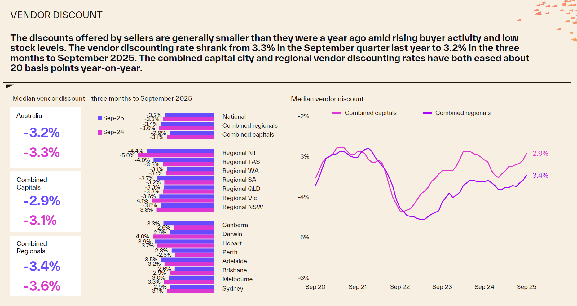 The vendor discounting rate tightened from 3.3% to 3.2% over the year, indicating stronger buyer competition and limited supply, giving sellers more pricing power.