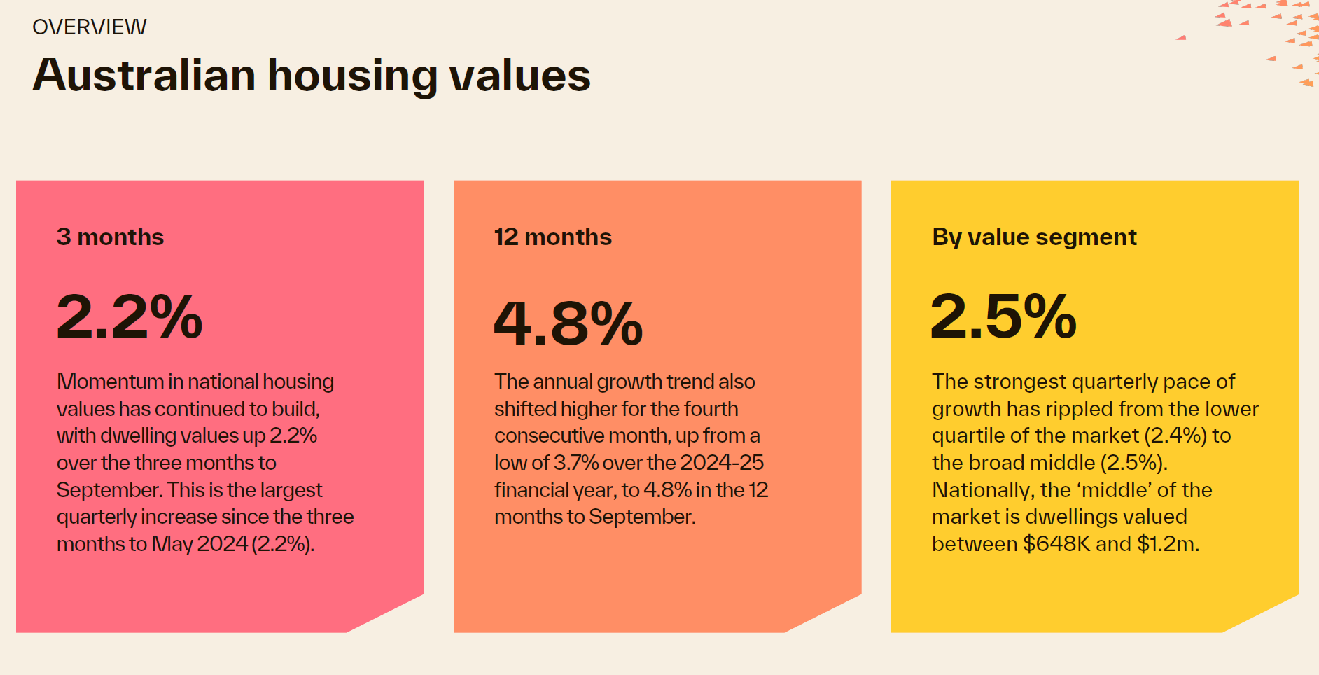 Australian dwelling values rose 2.2% over the three months to September — the largest quarterly gain since May 2024. Annual growth strengthened for the fourth consecutive month, reaching 4.8% over the year to September.