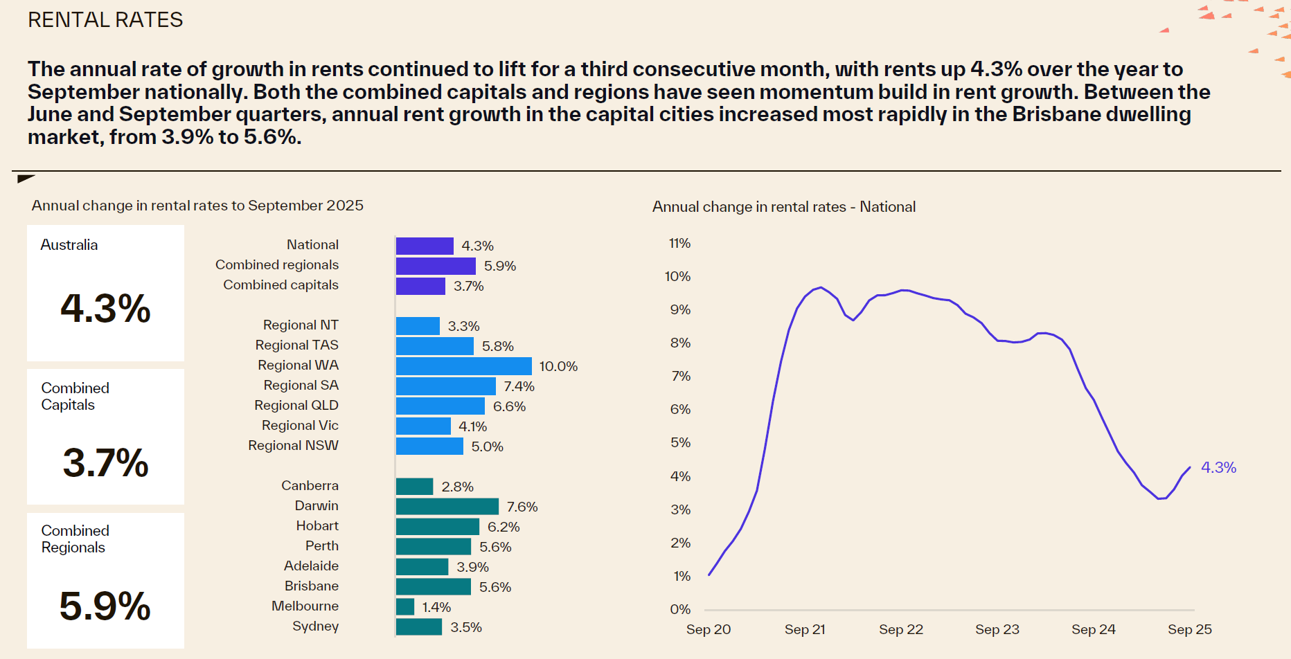 National rents grew 4.3% over the year to September, with capital cities (+5.9%) and regional areas (+3.7%) both showing accelerating trends.